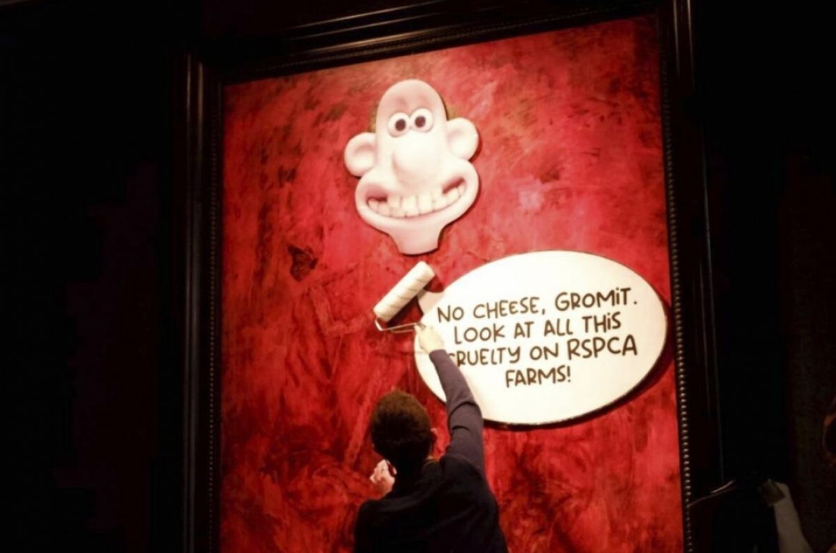 Animal Rising compartió un video de los manifestantes pegando la imagen del personaje Wallace, de la serie de comedia "Wallace and Gromit", sobre la cabeza del rey. La "redecoración humorística" pretendía llamar la atención sobre una investigación que, según el grupo, descubrió violaciones generalizadas en granjas aprobadas por la Real Sociedad para la Prevención de la Crueldad contra los Animales (RSPCA). En un globo de diálogo junto a Wallace se lee: "No hay queso, Gromit. ¡Mira toda esta crueldad en las granjas de la RSPCA!".