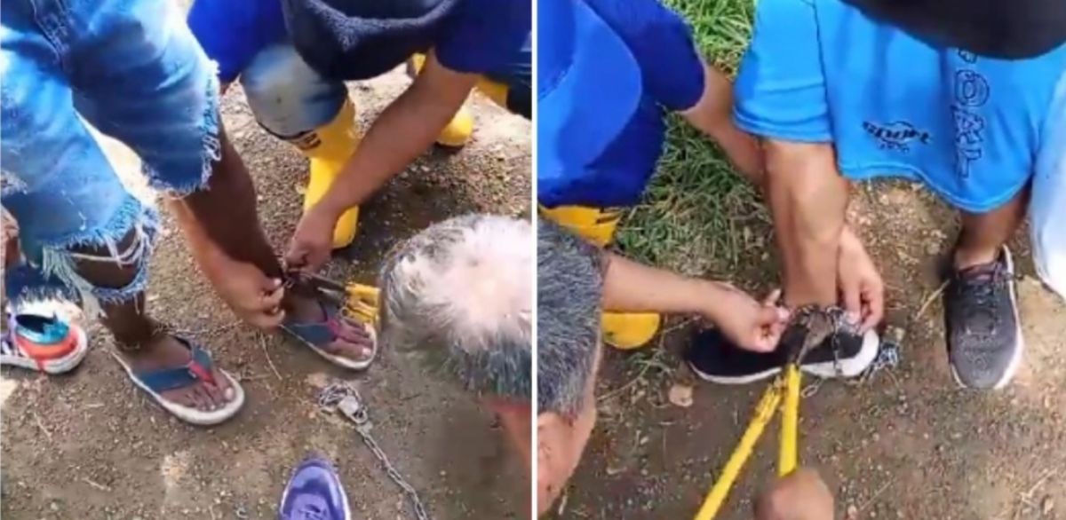 En las impactantes imágenes, se observa a varios hombres encadenados de los pies, quienes afirman haber sufrido violencia y privación de libertad en este lugar
